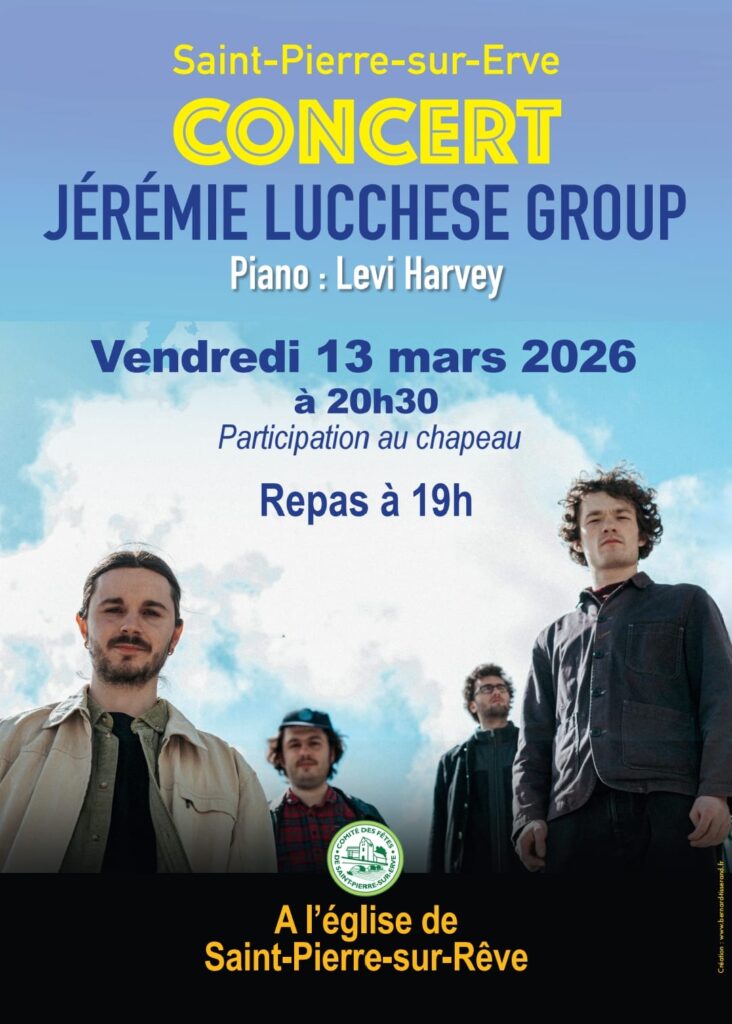 CONCERT ST PIERRE SUR ERVE Publication publiée :25 février 2026 Post category:Vu dans la presse Jérémie LUCCHESE GROUP VENDREDI 13 MARS A 20H30 Related Images: Vous devriez également aimer EXPOSITION Alice Guittard « Biographie de mes fantômes » la Chapelle des Calvairienne à Mayenne 9 février 2024 AND ART 10 ANS 18 septembre 2024 L’APSL présente à la fête des lumières de ST PIERRE SUR REVE 28 août 2024